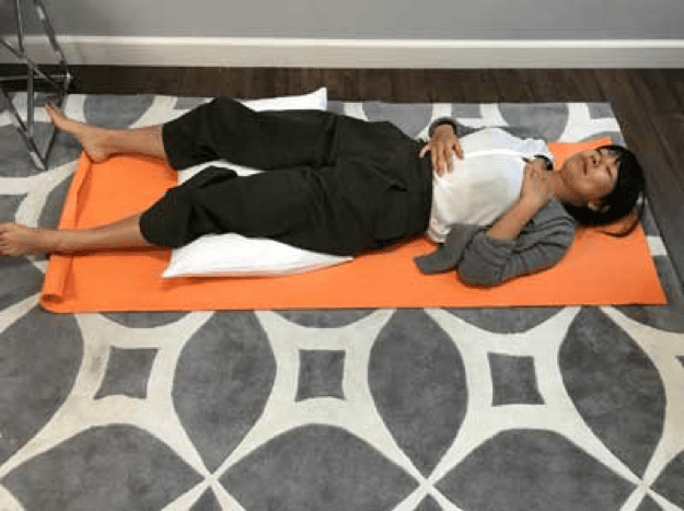 - Lay on your back. Knees can be bent with feet flat on the floor, or knees can be propped up on a pillow or bolster.